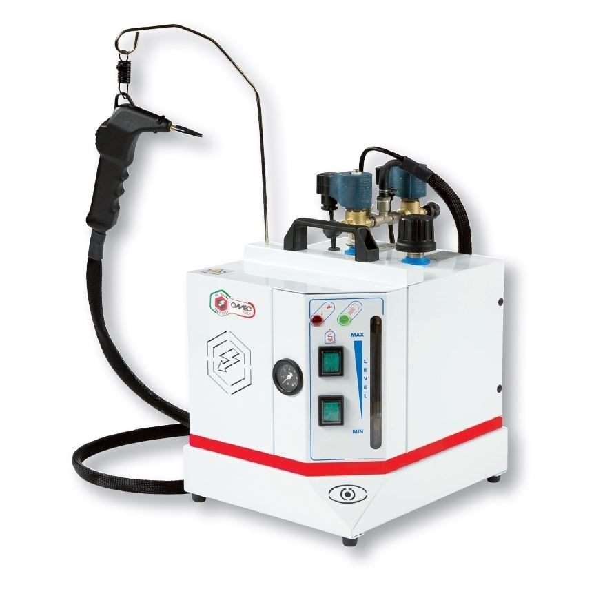 Пароструйный аппарат GP.92.5, предназначен для обезжиривания каркасов протезов паром или водно-паровой смесью под давлением. Давление 5 бар. Устройство имеет 5-литровый резервуар из нержавеющей стали (тип AISI 304), манометр для измерения давления в резервуаре, предохранительный колпачок и сливной кран для очистки резервуара. Подача пара выходит из пистолета низкого напряжения и может регулироваться с помощью кранов на электромагнитных клапанах. Устройство соответствует стандарту PED 97/23. Наполнение бака водой производится вручную. Модель оснащена смотровым окном для наблюдения за уровнем воды. Генерирует пар под давлением 5 бар. Заправляется вручную дистиллированной водой. Объем бака 5 л. Температура пара 155 °С.