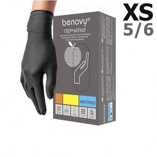 Перчатки ЧЕРНЫЕ нитрил Benovy XS (5/6), 3г. 100шт.