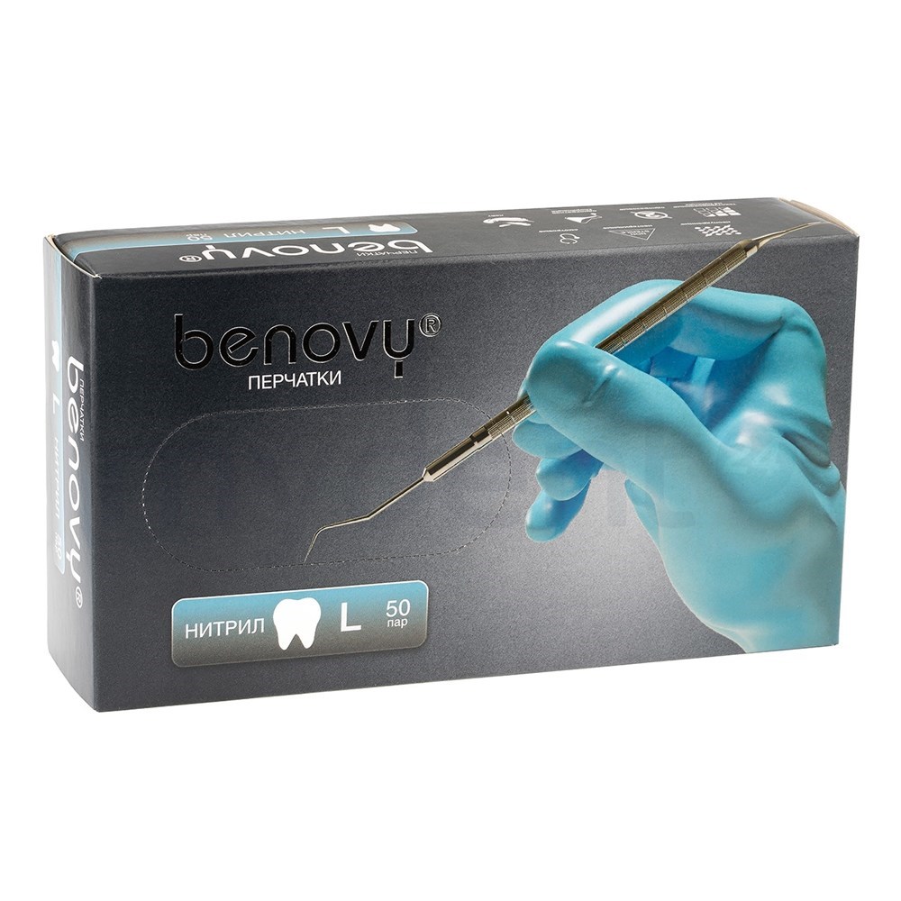 89811_Перчатки нестерильные "BENOVY" нитриловые текстурированные неопудренные с однократной хлоринацией (манжета с валиком); цвет: голубой, размер L (вид 185830) упак. 50 пар