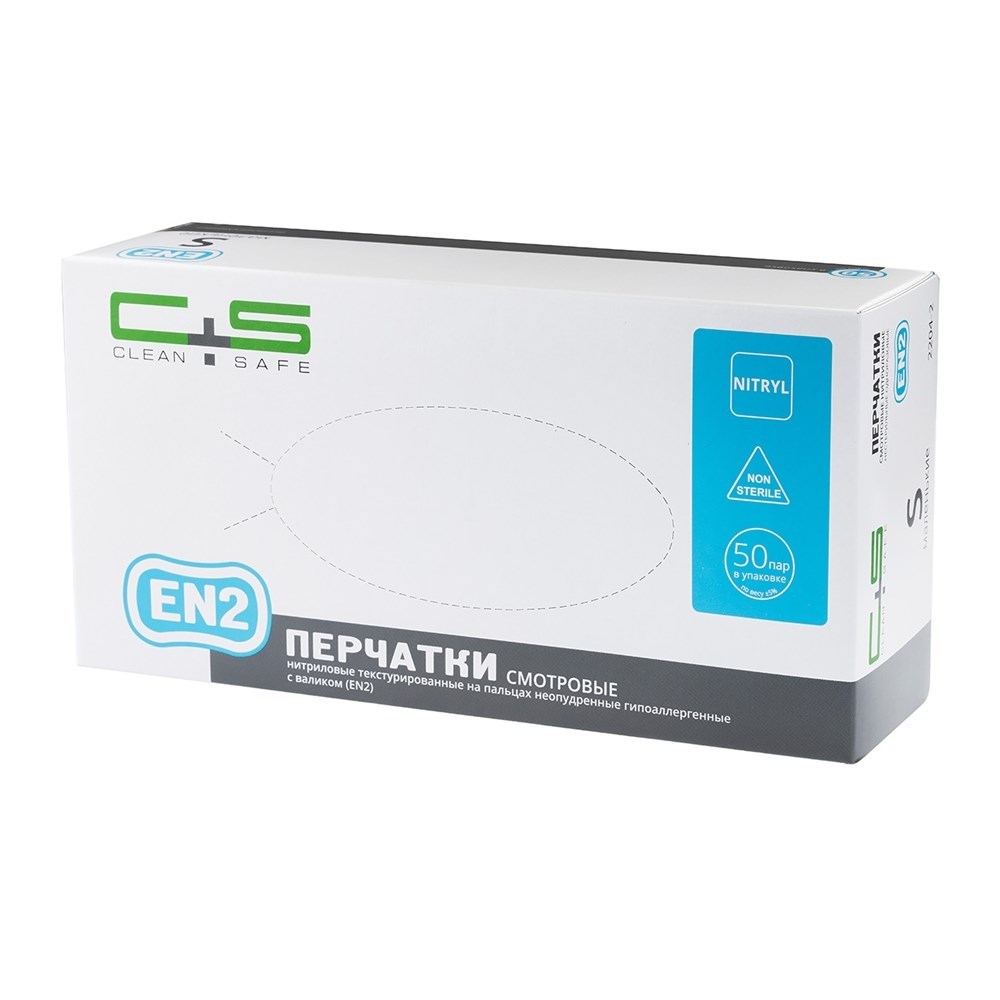 Перчатки смотровые нитрил. текстур.на пальцах неопудр.с валиком (EN2), Clean+Safe, 4, S (уп. 50 пар)
