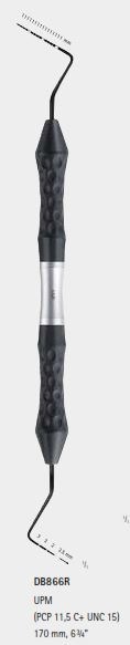 Периодонтометр, UPM, длина 170 мм, DB866R, B.Braun (Aesculap, Германия) состоит из эргономичной ручки черного цвета, изогнутой, двухсторонней рабочей части с плавными переходами и нитридным покрытием, на которой нанесена точная лазерная маркировка. Инструмент предназначен для выявления в ткани зуба зоны, которая подверглась разрушению кариесом.