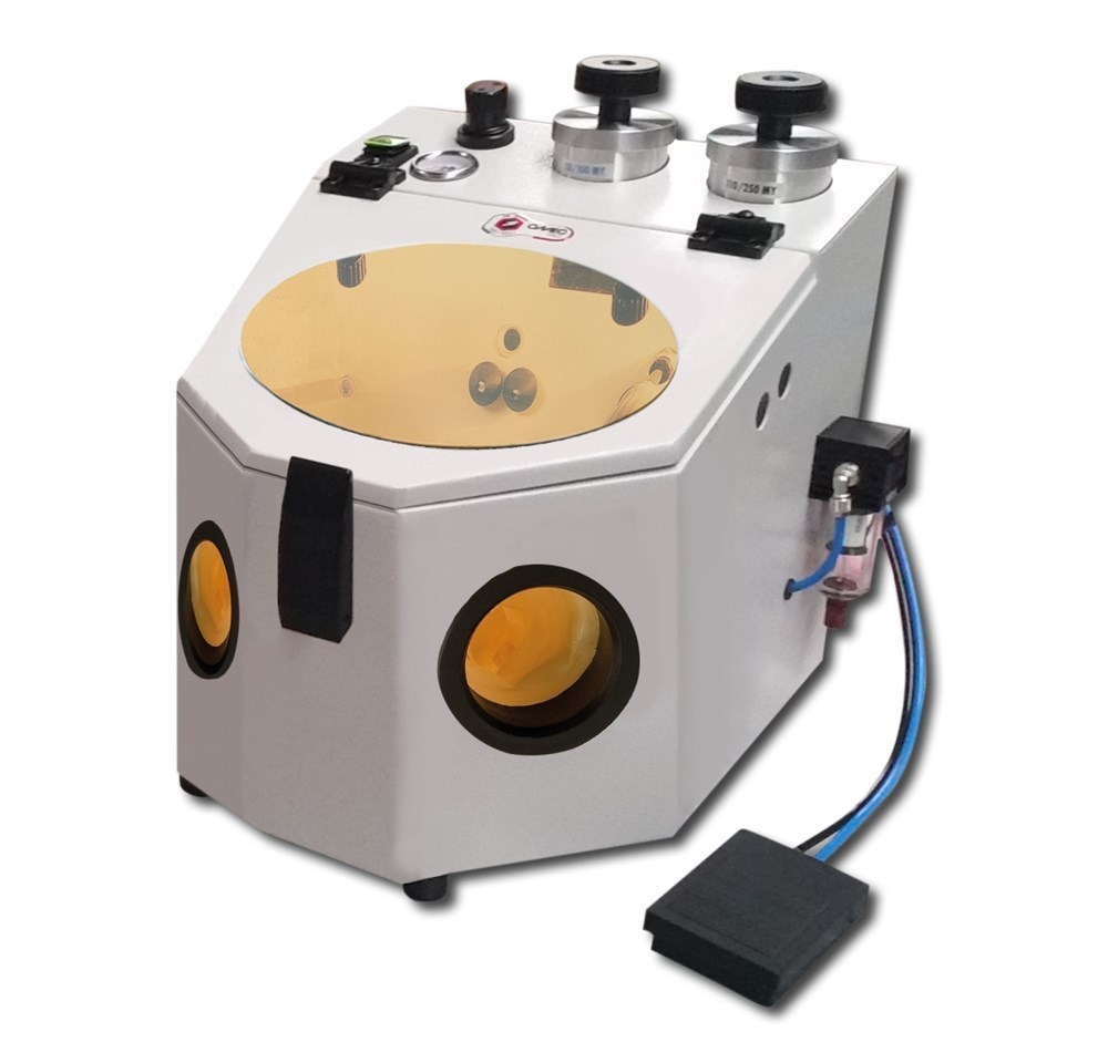 Микропескоструйный аппарат имеет внутреннее освещение, регулятор давления на каждую емкость струйного средства, штуцер для вытяжного вентилятора, манометр и селектор песка внутри пескоструйной камеры. Диаметр сопел 0,8 (рекомендовано средство 50-100 мкм) и 1,0 мм (рекомендовано средство 150-200 мкм). Необходимо подключение сжатого воздуха, давление 2-4 бар, расход 100-120 л/мин. По запросу возможно изготовление устройства для рециркуляции песка (диаметр сопла 3,5 мм).