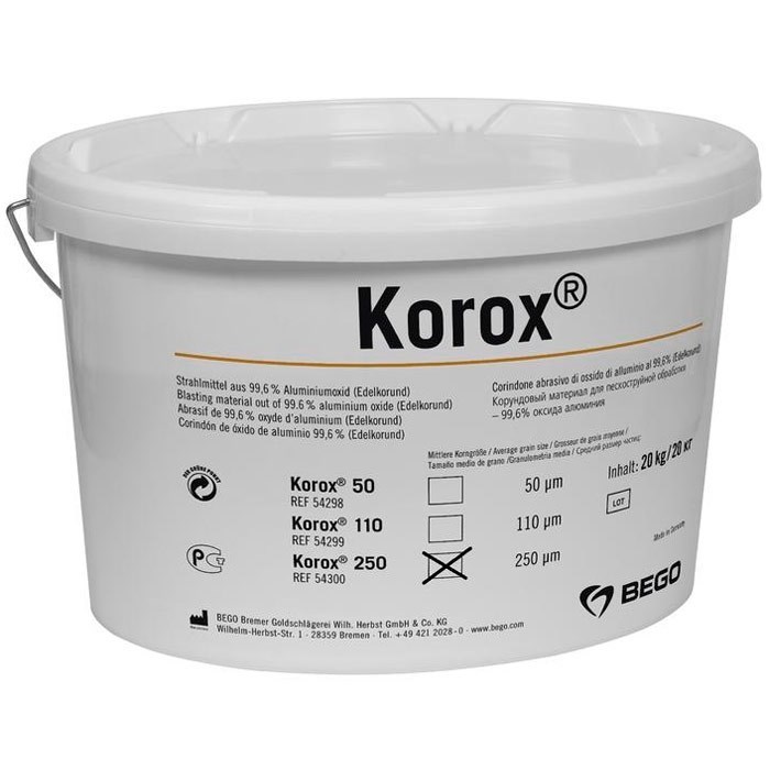 Korox 250 - при работе с ручными соплами материал можно применять не только для удаления паковочной массы и оксидов, но и для обработки поверхности каркасов из неблагородных сплавов перед керамическим обжигом.