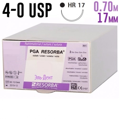 Описание: ПГА РЕСОРБА 4-0 USP, 0.70 м, 17мм, 24 шт, фиолетовыйМатериал шовный хирургический ПГА РЕСОРБА (PGA RESORBA), нить фиолетовая 4/0(1.5) 70см., игла HR 17мм. 1/2, колющая, 24 шт.
