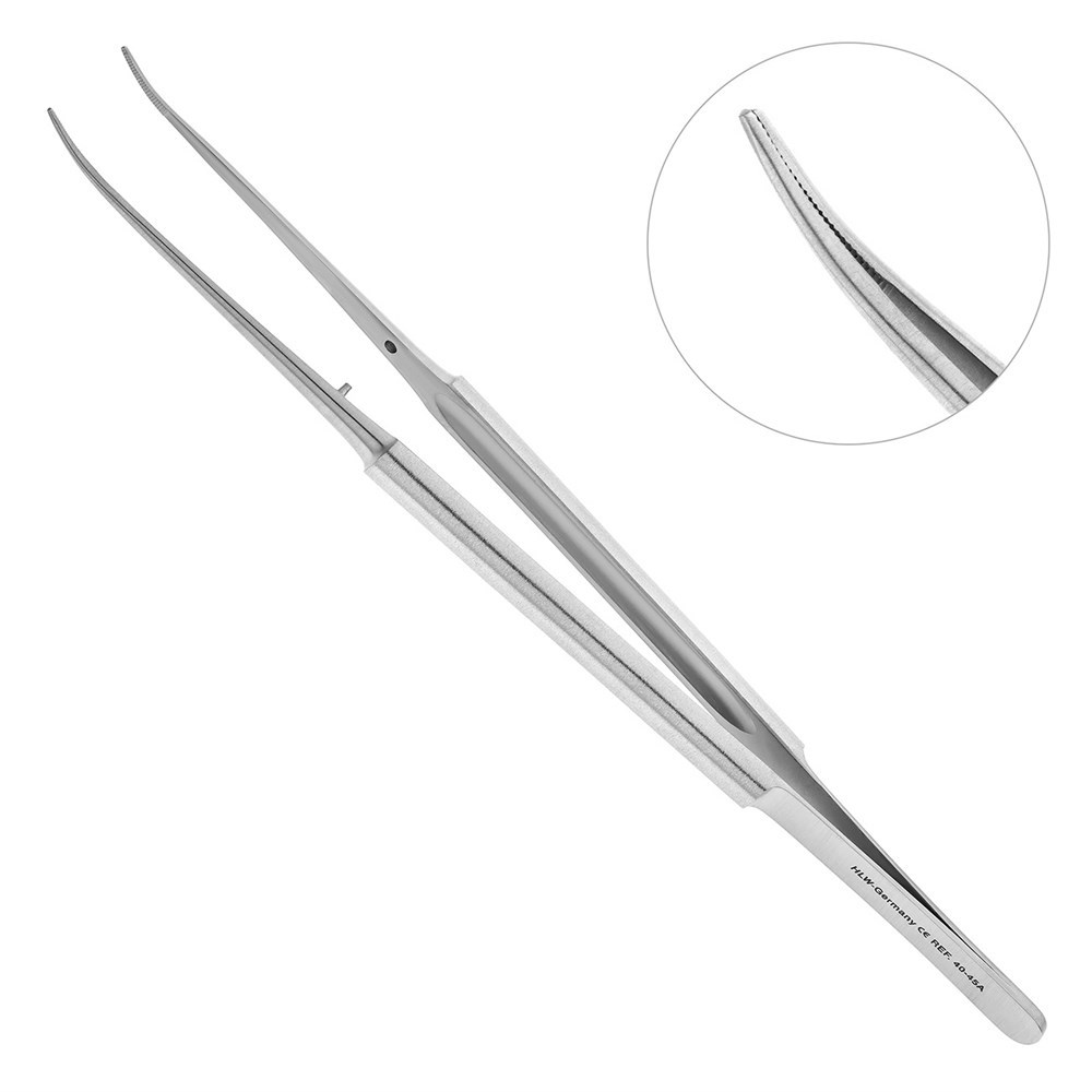 Микрохирургический пинцет с анатомической формой исполнения рабочих частей предназначен для различных манипуляций в ротовой полости. Производителем инструмента является компания HLW Dental Instruments.