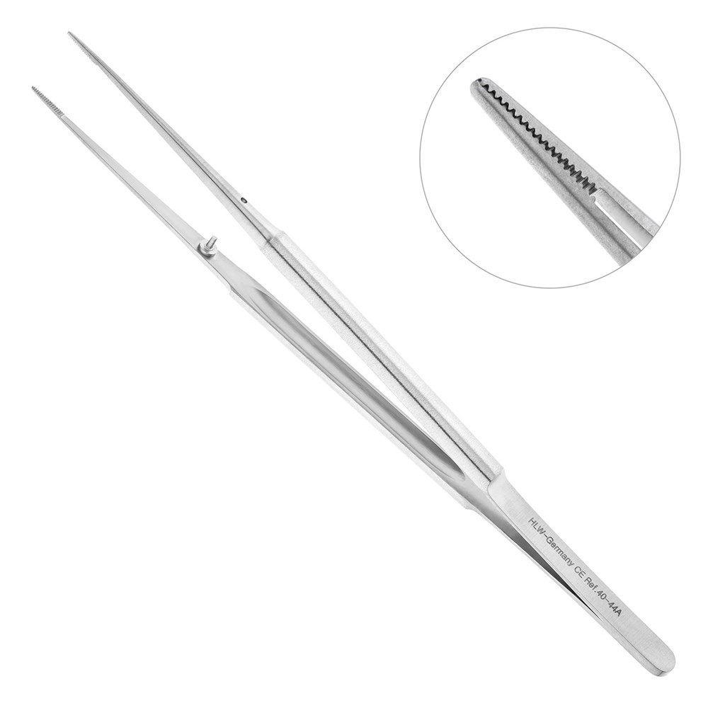 Для захвата, а также удерживания мягких тканей при проведении манипуляций в ротовой полости применяется микрохирургический пинцет с анатомической формой исполнения рабочих частей. Инструмент изготовлен компанией HLW Dental Instruments.