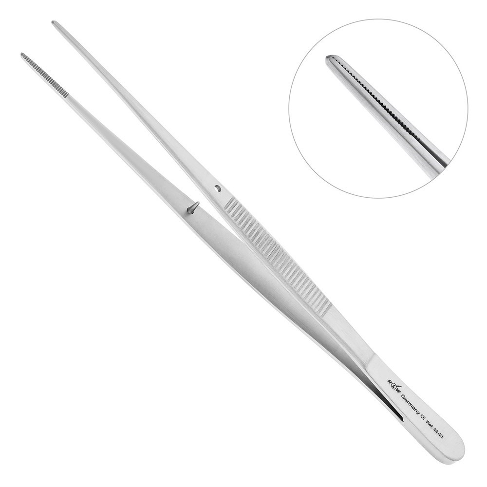 Прямые рабочие части пинцета имеют ретенционный узор на внутренних поверхностях, благодаря чему инструмент надежно фиксируется на различных вспомогательных и диагностических принадлежностях, а также мягких тканях в ротовой полости. Тонкие и узкие бранши анатомического пинцета обеспечивают хорошую визуализацию рабочего поля при манипуляциях в полости рта.