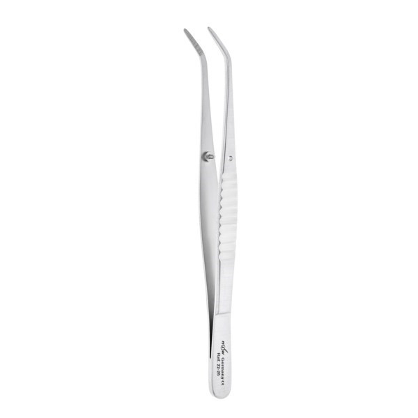Пинцет анатомический изогнутый. Общая длина не более 15 см. Ручки пинцета усилены за счет увеличения толщины металлических пластин, внешняя поверхность имеет полукруглые выемки, расположенные перпендикулярно оси рукоятки инструмента. Рабочие части изогнуты под тупым углом по плоскости, на внутренней поверхности имеют продольные атравматичные насечки.