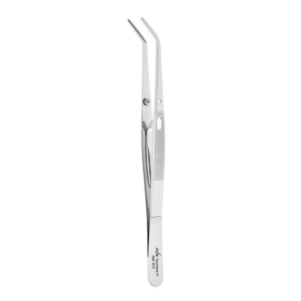 Пинцет анатомический изогнутый. Общая длина не более 15 см. Внешние поверхности ручек имеют горизонтальные ретенционные насечки, предотвращающие выскальзывание инструмента. В центральной части инструмента имеется зажимной механизм, позволяющий зафиксировать пинцет в закрытом положении. Рабочие части изогнуты под тупым углом по плоскости, на внутренней поверхности имеют продольные борозды по всей длине рабочей части с обеих сторон для фиксации пинов.