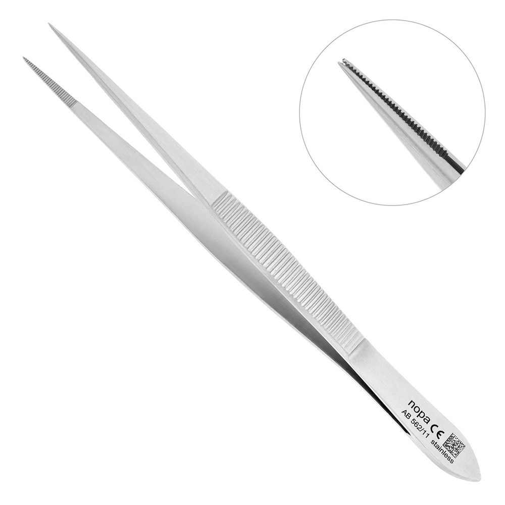 Анатомический пинцет торговой марки Nopa Instruments предназначен для различных манипуляций в ротовой полости. Небольшой инструмент имеет тонкие, узкие и острые бранши, которыми удобно добраться до труднодоступных участков полости рта. На окончании рабочей части пинцета расположены ретенционные насечки, которые плотно захватывают и удерживают рабочий материал.