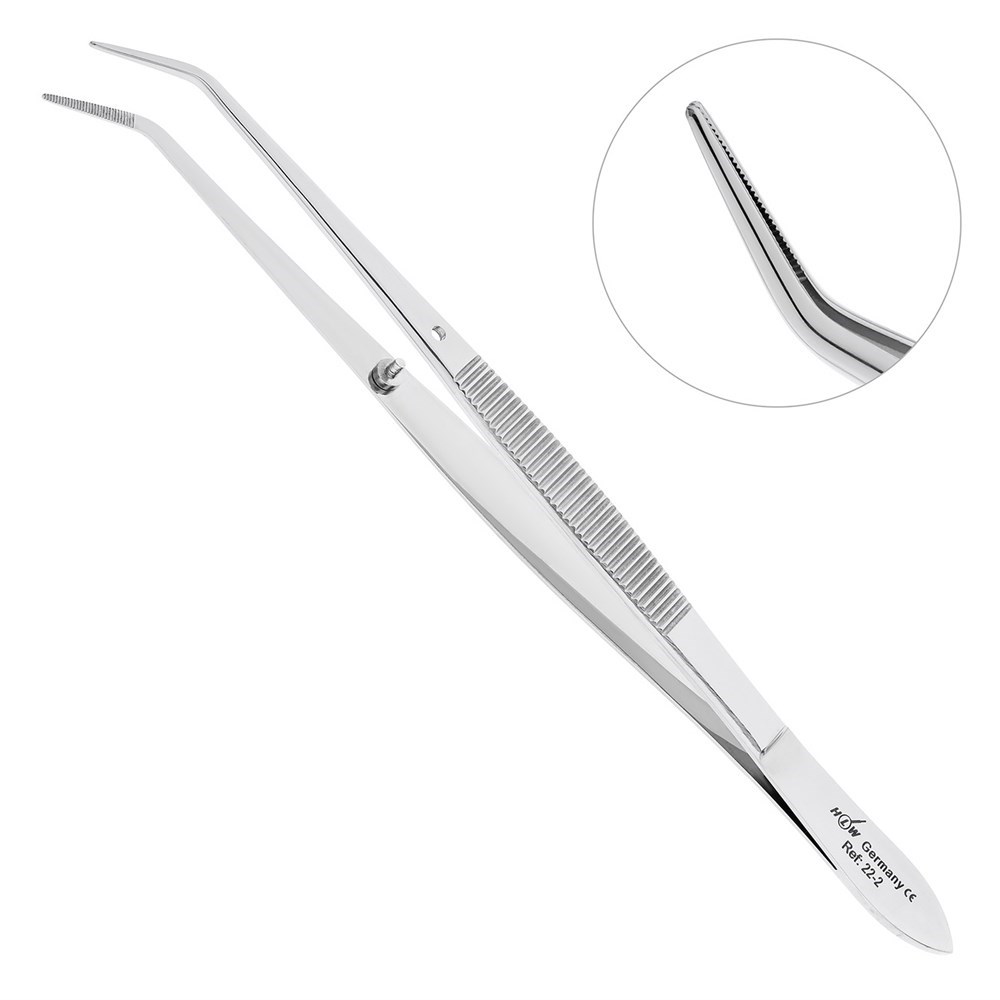 Рабочая часть пинцета имеет изгиб по плоскости, что способствует введению микро пинцета в глубокие и труднодоступные участки полости рта. Внутренние поверхности браншей инструмента имеют поперечные насечки для деликатного захвата и удерживания мягких тканей в ротовой полости.