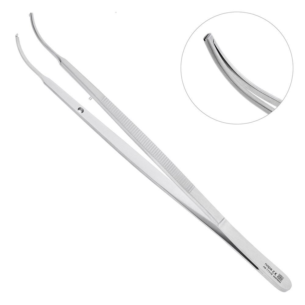 Стоппер на внутренней поверхности инструмента способствует плотному смыканию рабочих частей пинцета и предотвращает их расхождение друг относительно друга.