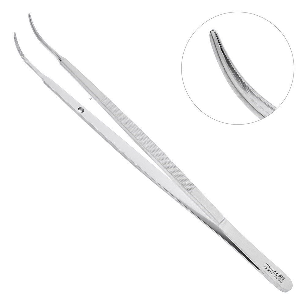 Изгиб по плоскости в рабочей части инструмента позволяет ввести пинцет в глубокие и труднодоступные участки полости рта. Благодаря узким, вытянутым и тонким браншам инструмента обеспечивается хорошая визуализация рабочего поля. Ретенционный узор на внутренних рабочих поверхностях пинцета дает возможность плотно фиксировать мягкие ткани в ротовой полости.