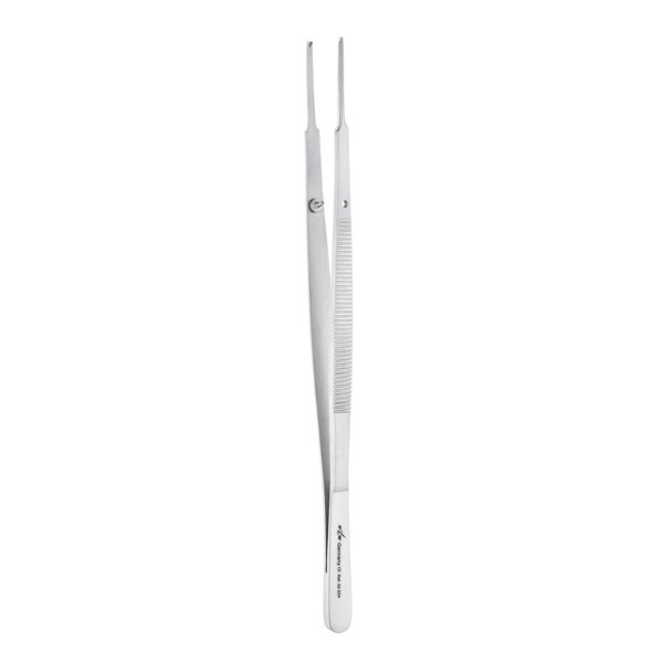 Пинцет хирургический конструкции ДЖЕРАЛЬДА, прямой, длина не менее 18 см. Узкие бранши, облегченное сжатие, истонченная рабочая часть, позволяет осуществлять прецизионные манипуляции и обеспечивает максимальный обзор рабочего поля. Тонкая рабочая часть удобна также при работе с электрокоагулятором. Направляющие на внутренней поверхности браншей гарантируют точно сопоставление концов рабочих частей инструмента. Противопоставленные рабочие поверхности имеют зубцы треугольного сечения, два зубца на одной рабочей части в латеральном положении и один центрально расположенный на противоположной, что обеспечивает надежную фиксацию лоскута, при сближении рабочих поверхностей.