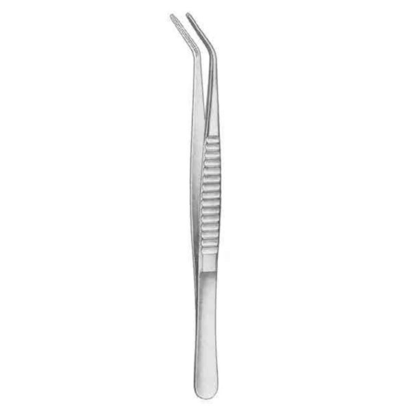Хирургический пинцет с изогнутым рабочим краем, атравматичный.
