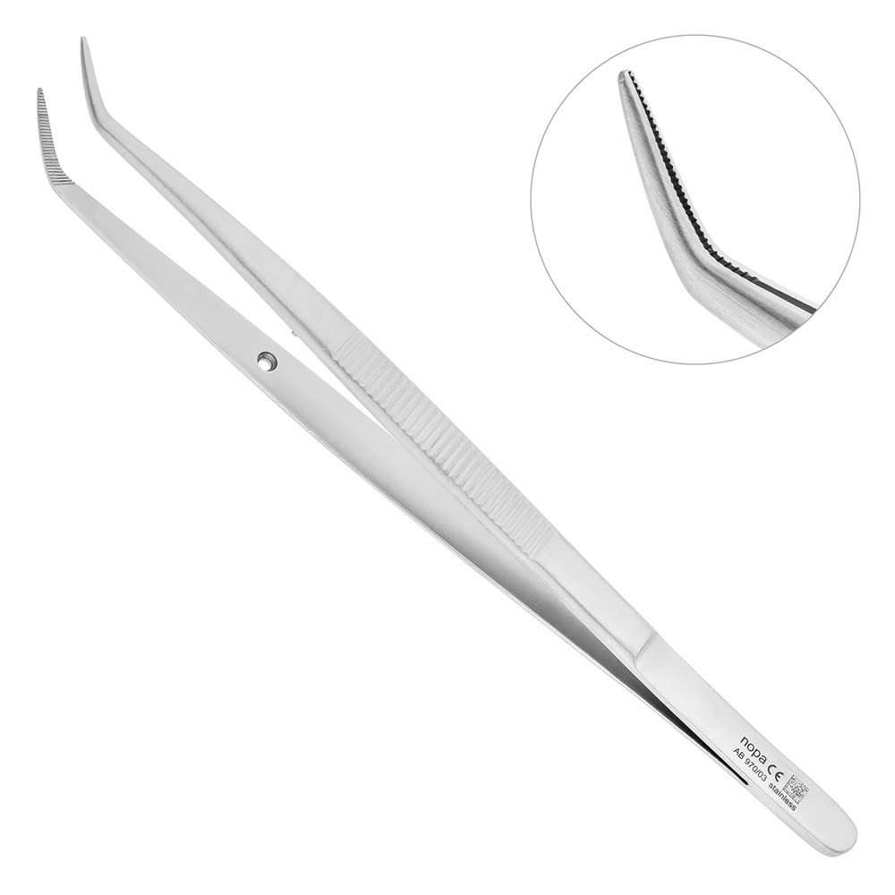 Пинцет LONDON COLLEGE №3 с анатомической формой исполнения рабочих частей применяется для различных манипуляций в ротовой полости. Бранши пинцета с внутренней стороны снабжены насечками в виде параллельных линий для деликатного захвата и удерживания мягких тканей в ротовой полости. Рабочие части инструмента очень тонкие и узкие, а также имеют изгиб по плоскости, благодаря чему обеспечивается хороший обзор при манипуляциях в полости рта.