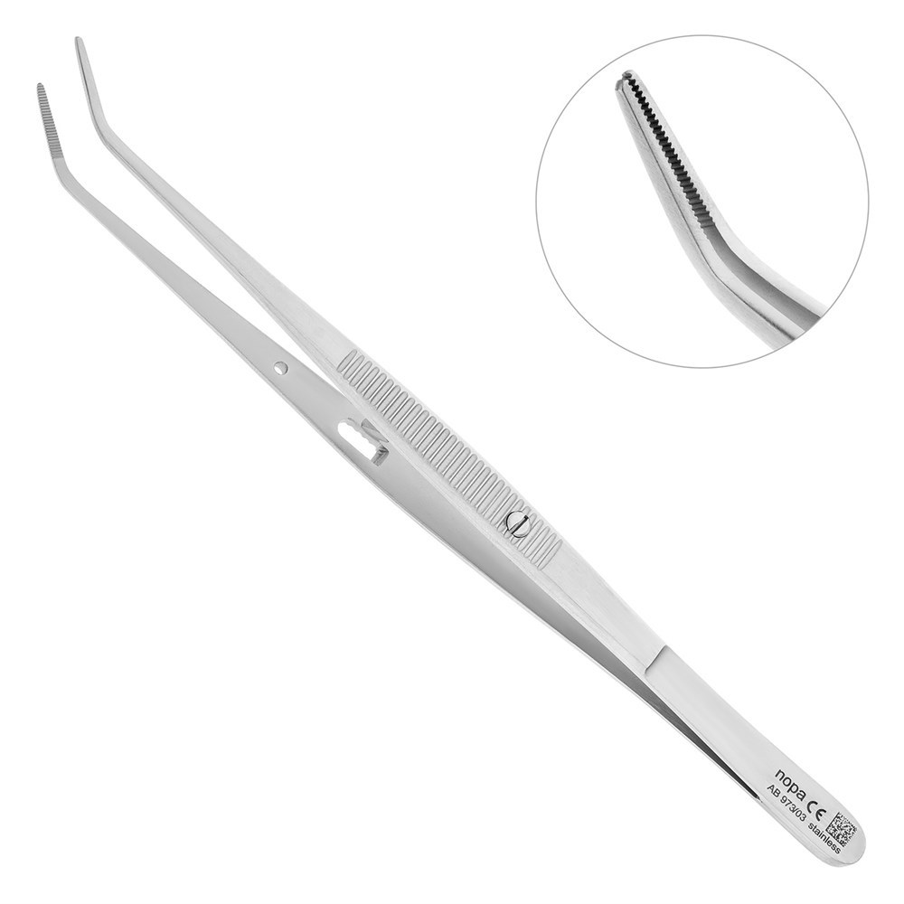 Перевязочный пинцет LONDON COLLEGE №3 с фиксатором используется для удержания мягких тканей в челюстно-лицевой области. Поперечные насечки на внутренних поверхностях браншей пинцета надежно захватывают и фиксируются на поверхности рабочего материала. Изгиб рабочей части по плоскости инструмента способствует введению анатомического пинцета в глубокие и труднодоступные участки полости рта. Тонкие и узкие бранши обеспечивают хорошую визуализацию операционного поля.