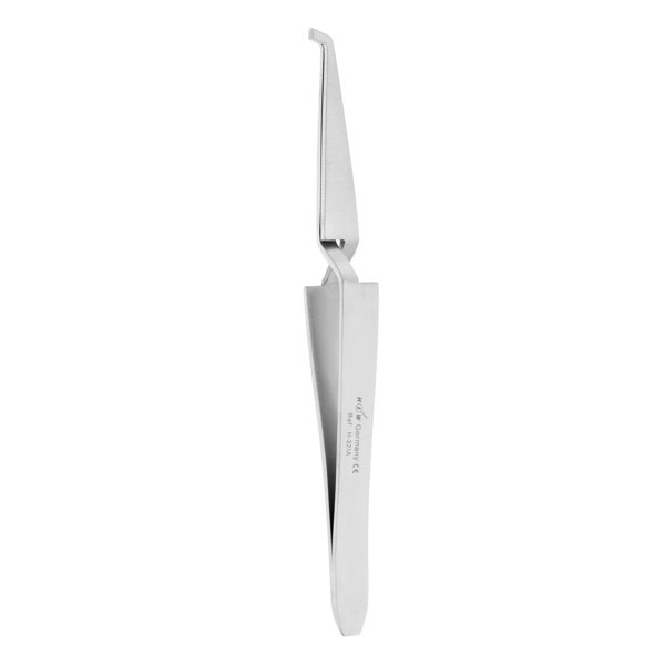 Пинцет изогнутый лингвальный обратный. Используется для удержания и установки брекетов на поверхность зуба. Тыльная сторона пинцета используется для удаления излишков адгезивного и иного материала из области проведения манипуляции Рабочая часть имеет серповидный изгиб относительно продольной оси инструмента.