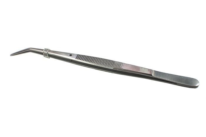 Пинцет стоматологический изогнутый Пси (150 х 0,8) с узкими губками, изогнутыми по ребру, применяется при различных манипуляциях в ротовой полости. Изготовлен из нержавеющей стали. Длина 150 мм, ширина рабочей части 0,8 мм.