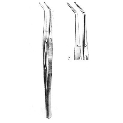 Пинцет стоматологический изогнутый с фиксатором 103-071, 15см (с насечками, ребристый)