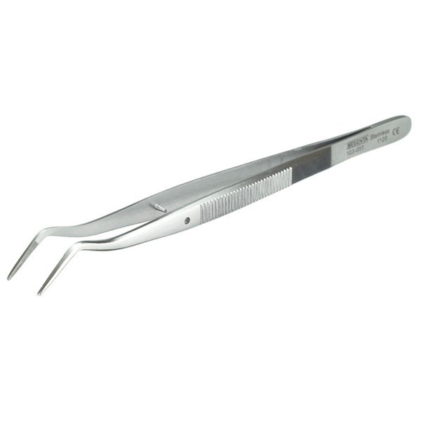 Пинцет анатомический изогнутый. Внешние поверхности ручек имеют горизонтальные насечки, предотвращающие выскальзывание инструмента. Рабочие части изогнуты под тупым углом по плоскости.