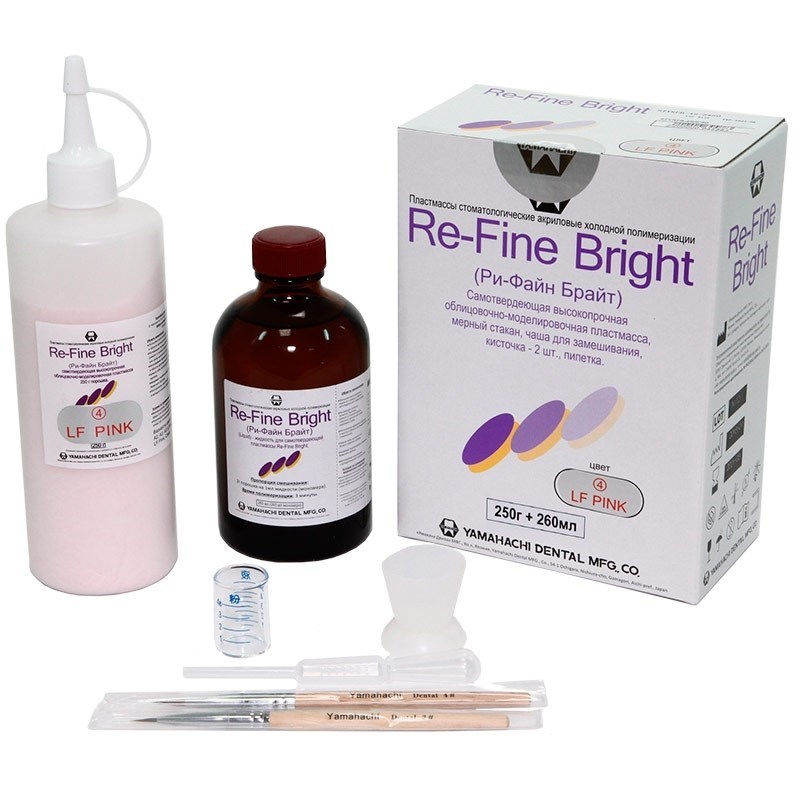 Re-Fine Bright самотвердеющая пластмасса для временных коронок с быстрой полимеризацией, набор цвет 4-LF Pink (розовый с прожилками), 250 г и жидкость 260 мл. Данная высокопрочная пластмасса используется для реставрации съемных протезов (ремонт и починка базиса съемного протеза или скола акрилового зуба); изготовления временных коронок и мостов; не прямой перебазировки съемного базисного протеза; облицовки металлических каркасов и замков; замены зуба, выпавшего из съемного протеза; изготовления ортодонтических конструкций.