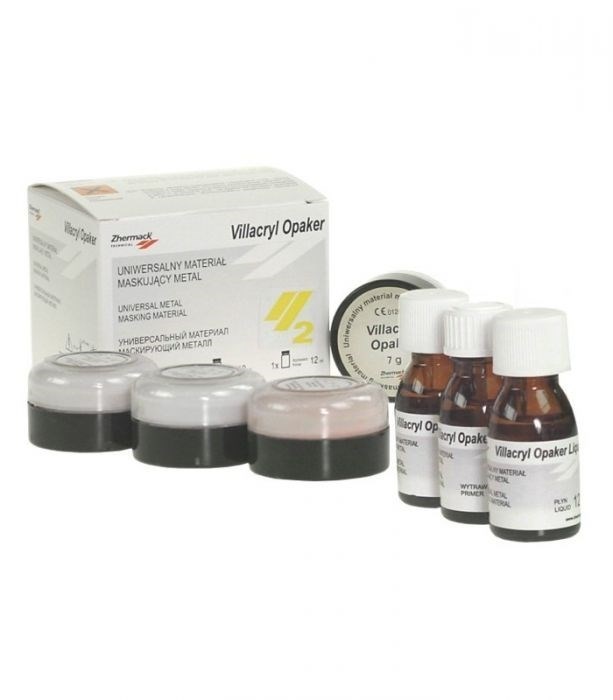 Пластмасса Виллакрил Opacer. Материал акриловый покрывной для металлических частей съемных и несъемных протезов. Отверждается под давлением. Цвета серый, желтый, розовый, светло-розовый. Упаковка 4 х7 г порошка каждого цвета, праймер 12 мл, жидкость 2х12 мл жидкость.