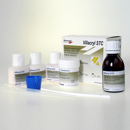 Пластмасса Villacryl STC для временных корон и мостов. Полиметакрилатный материал холодной полимеризации предназначен для изготовления временных коронок и мостовидных протезов, а также для ремонта коронок и мостовидных протезов, облицованных акриловой пластмассой. Три цветовые оттенка похожие на основные цвета естественных зубов и расцветки по VITA *- А1, А3, А4. Низкая температура самополимеризации, короткое время самополимеризации, хорошо переносится пациентом, не содержит тяжёлых металлов, нейтрален биологически. Упаковка: порошок - 3 флакона по 20 г, жидкость - 40 мл, отвердитель 40 г.