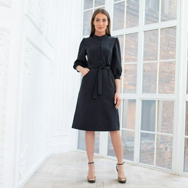 Платье Beauty бренда Dr.Nice имеет длину миди, рукав 3/4, а также воротник-стойку и планку. Модель дополнена карманами, которые расположены в рельефах. Идёт в комплекте с поясом.
