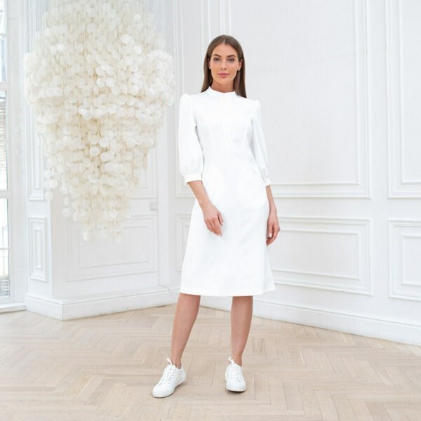 Платье Beauty бренда Dr.Nice имеет длину миди, рукав ¾, а также воротник-стойку и планку. Модель дополнена карманами, которые расположены в рельефах. Идёт в комплекте с поясом.
