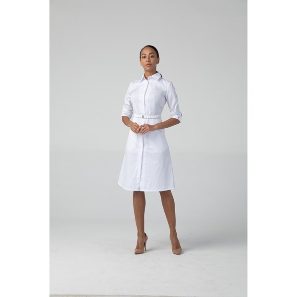 Платье-халат Dr.Nice с рукавом ¾ с отворачивающимися манжетами выполнено в классическом крое на супатной застежке. Модель дополнена двумя карманами в боковых швах и эластичным поясом с пряжкой.