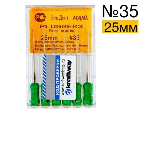 Описание: Pluggers Mani №35 (25 мм) упаковка 6 шт.Mani Pluggers - Ручной стоматологический эндодонтический инструмент с рабочей частью в форме гладкого усечённого стержня с тупым плоским концом. Материал рабочей части - нержавеющая сталь, материал рукоятки – пластик (полибутилентерефталат)..