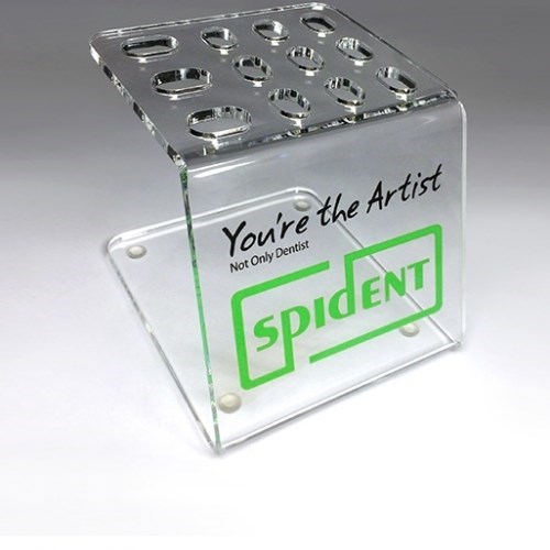 Фирменная подставка Spident, изготовлена из прочного оргстекла, удобная в использовании, селиконовые ножки позволяют надежно зафиксировать расположение на рабочем месте, вмещает до 12 шприцов.