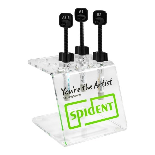 Фирменная подставка Spident, изготовлена из прочного оргстекла, удобная в использовании, силиконовые ножки позволяют надежно зафиксировать расположение на рабочем месте, вмещает до 12 шприцов.