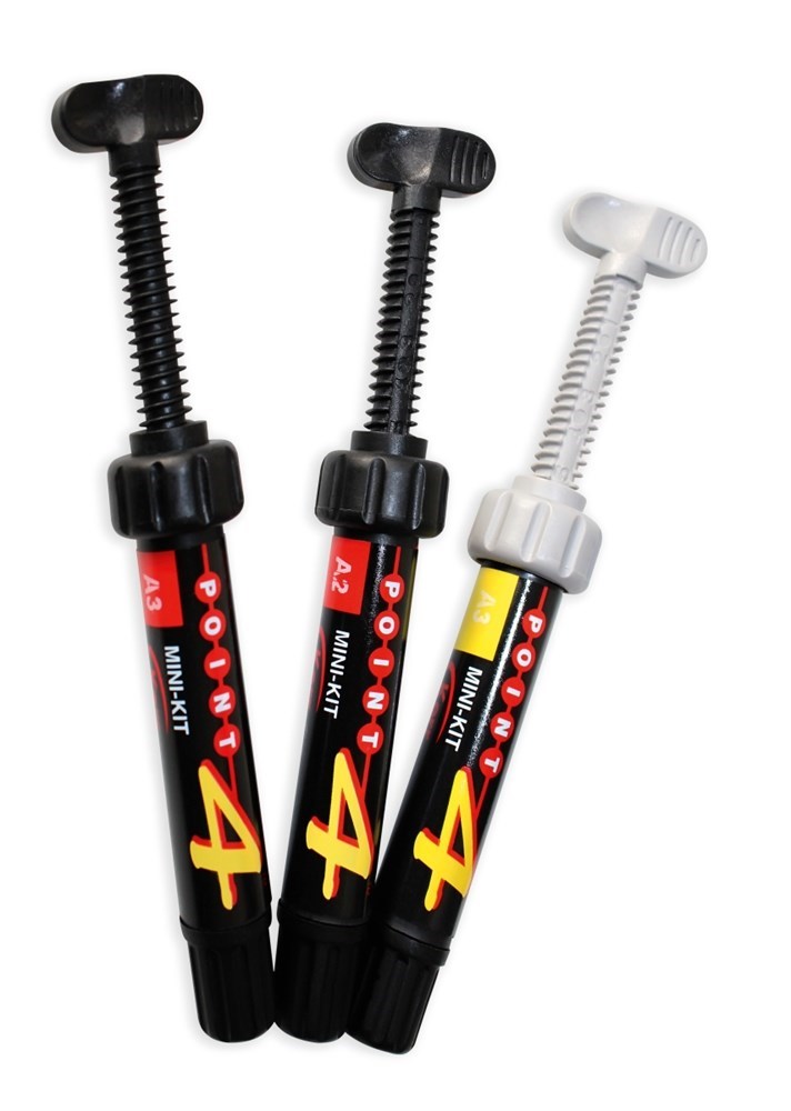 Композитная система с оптимизированными частицами (средний размер 0,4 мк). Данный микрогибридный композит для реставраций фронтальных и жевательных зубов представлен в 16 оттенках в шкале Vita®, в том числе 3 прозрачных, и 8 опаковых. Point4тм придает реставрациям естественный вид, эстетические качества и прочность, что возможно только благодаря использованию комбинации гибридных и микронаполненных материалов.