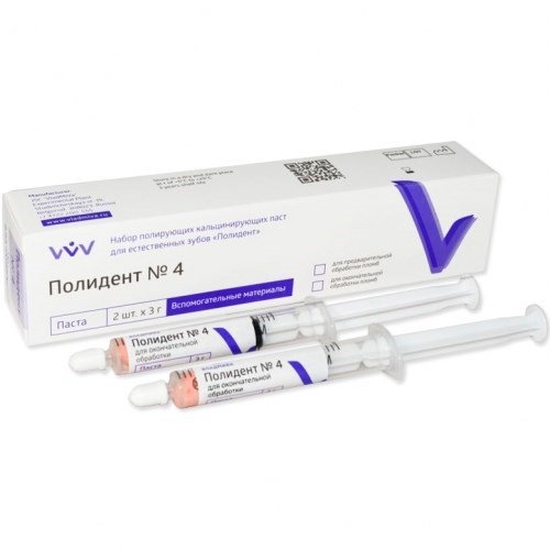 Описание: Полидент №4 для окончательной обработки пломб (6г) ВладМиВаПаста «Полидент № 4» содержит абразив, гидрофильный пастообразователь и инертный наполнитель.