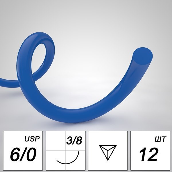 Полипропилен - мононить 6/0 75 см (синяя), игла обратно-режущая 13 мм 3/8, 12 шт