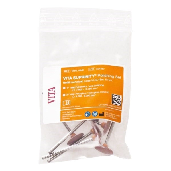 Полировальные инструменты VITA SUPRINITY были разработаны для надежной, эффективной и индивидуальной обработки поверхности реставраций из литиево-силикатной керамики (ZLS), армированной диоксидом циркония, в стоматологических кабинетах и лабораториях. В ассортименте представлены различные наконечники для предварительной и полировки до зеркального блеска. Эти инструменты подходят для аккуратной и щадящей полировки окклюзионных поверхностей, бугров, фиссур и точек контакта реставраций. Они обеспечивают сияющий блеск готовой реставрации.
