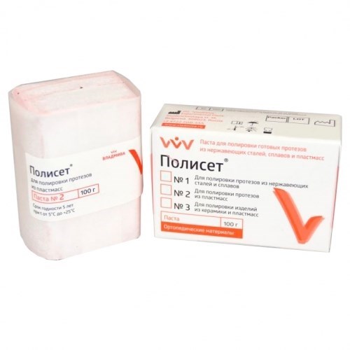Описание: Полисет №2 - для полирования изделий из пластмассы (100г) ВладМиВаПасты «Полисет» для полирования стоматологических изделий содержат различные абразивы, поверхностно-активные и связывающие вещества.