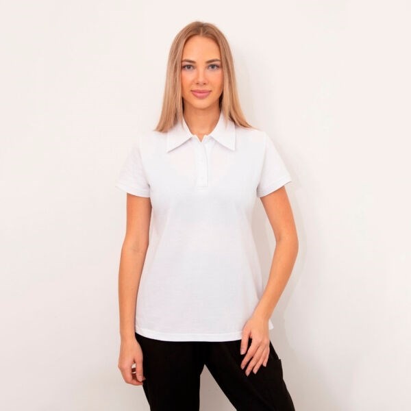 Женское медицинское поло TZ050 с коротким рукавом и отложным воротничком. Застежка на пуговицах, в боковых швах имеются разрезы.