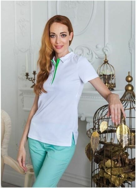 Футболка-поло белого цвета с яркой отделкой на вырезе непременно понравится девушкам, которые любят спортивный стиль. Удобный крой и разрезы по бокам не сковывают движения и обеспечивают комфорт на протяжении всего рабочего дня. Не смотря на стильный и модный дизайн, данная модель сохраняет строгий вид формы, что важно для работников медицинских учреждений.