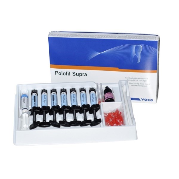 Polofil Supra - светоотверждаемый композит для пломбирования, набор (7 шприцов х 4 г, вокоцид гель 5 мл, солобонд М 4 мл)