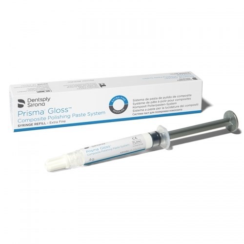 Полировочная паста для композитных материалов Prisma Gloss - водорастворимая паста на основе оксида алюминия, разработанная для окончательной полировки композитных реставраций фронтальных и боковых зубов, закрытий диастем, эстетических удлинений резцов или виниров. Применение полировочной пасты Prisma Gloss с пенообразующими полировочными чашечками Enhance улучшает гладкость окончательно обработанной поверхности микро-наполненных композитов до заключительного блеска высокой степени, или предварительно полирует гладкие окончательно обработанные поверхности гибридных и микро-гибридных композитов до блеска низкой степени. Для достижения заключительного блеска высокой степени поверхности гибридных и микро-гибридных композитов следует затем отполировать полировочной пастой Prisma Gloss Extra Fine.