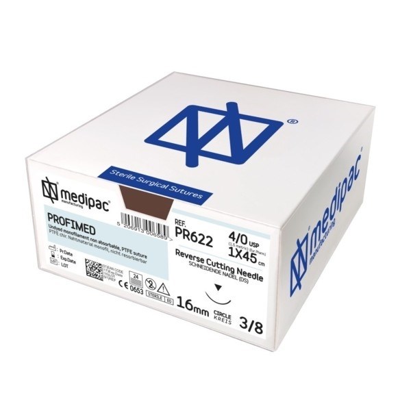 PROFIMED - диаметр 4/0, длина 75 см, обратно-режущая игла 19 мм, изгиб 3/8 окружности, 24 шт