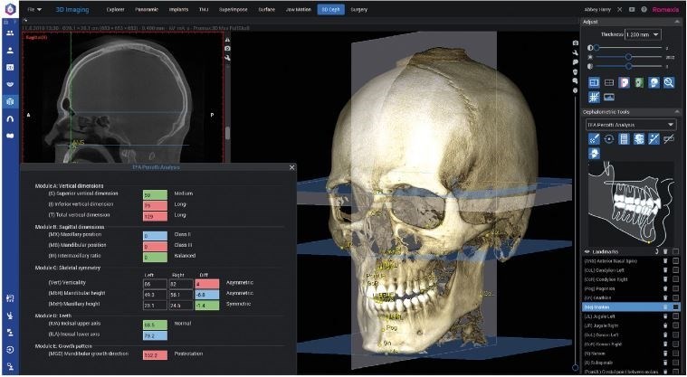 Romexis® 3D Cephalometry - это совершенно новый модуль Romexis® для выполнения цефалометрического анализа в 3D. Целью Romexis 3D Cephalometry является поддержание всех положительных аспектов обычного 2D-анализа, таких как ориентиры, измерения и их сравнение с нормами, а также предоставление надежной информации о морфологии, положении и ориентации анатомические структуры через определенные опорные плоскости и точки в 3D. Это инструмент, который улучшает диагностику ортодонтической КЛКТ, создавая четкое и интуитивно понятное графическое представление случая. Новый модуль безупречно работает с Romexis® CMF Surgery модуль, позволяющий пользователю продолжить хирургическое планирование сразу после трехмерного анализа и динамически видеть результаты хирургического планирования в трехмерном анализе.