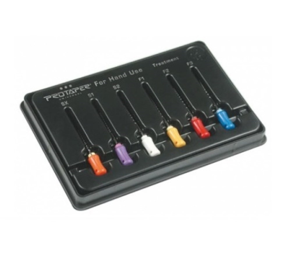 Pro Taper (протейперы) - новый вид вращающихся файлов с прогрессивной конусностью до 19 %, разработанный для обработки труднопроходимых и сильно изогнутых корневых каналов. Инструмент обладает большой гибкостью и высокой режущей способностью. Базовый набор включает 3 инструмента для формирования корневой части канала и 3 инструмента для окончательного препарирования.