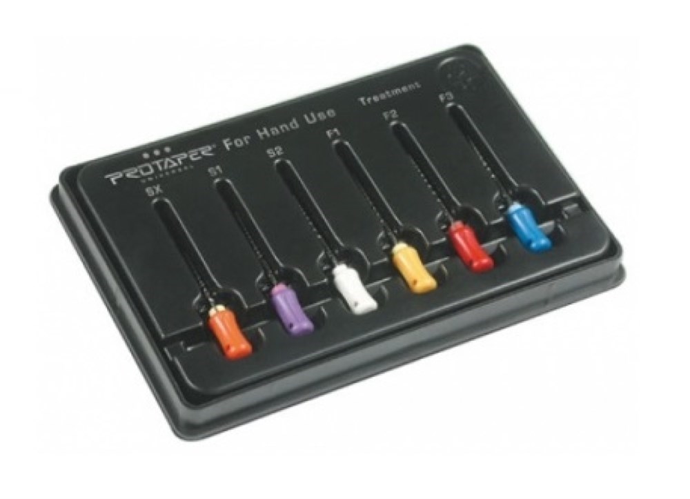 Pro Taper (протейперы) - новый вид вращающихся файлов с прогрессивной конусностью до 19 %, разработанный для обработки труднопроходимых и сильно изогнутых корневых каналов. Инструмент обладает большой гибкостью и высокой режущей способностью. Базовый набор включает 3 инструмента для формирования корневой части канала и 3 инструмента для окончательного препарирования.