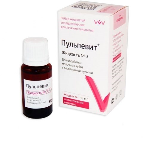 Описание: Пульпевит №3 (15мл) / формокрезол, ВладМиВаЖидкость №3 (формокрезол) содержит формальдегид (19%) и крезол (35%). Формокрезол в зависимости от продолжительности воздействия, приводит к частичной или полной мумификации корневой пульпы молочного зуба.