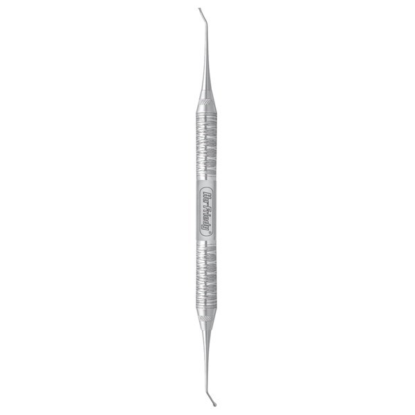 Двусторонний фронтальный рашпиль Hirschfeld от американского бренда Hu-Friedy справляется с самыми масштабными зубными отложениями. Изогнутый под тупым углом тонкий стержень обеспечивает стоматологу свободный доступ к области поражения. Миниатюрная рабочая часть с параллельно идущими острыми зазубринами аккуратно удаляет зубной камень из самых труднодоступных участков ротовой полости.