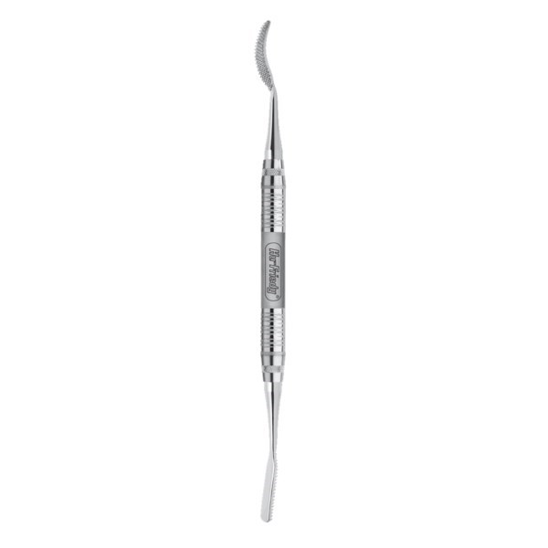 Двусторонний костный рашпиль 2X Miller-Colburn от компании Hu-Friedy (США) используется для придания формы кости и ее финальной обработки, сглаживания. Поперечные заостренные элементы, доведенные до идеала вручную, повышают эффективность за счет резки в двух направлениях. Разные формы рабочих частей позволяют врачу использовать один инструмент на разных участках ротовой полости. При этом каплевидная форма подходит для обработки внутренних стенок зуба, а прямоугольная изогнутая – для сглаживания кости на больших областях.